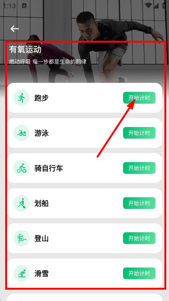 2、在有氧运动页面,选择运动项目,如点击跑步的开始计时。