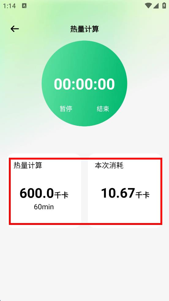 4、运动计时结束后,可查看热量计算和本次消耗的千卡数。