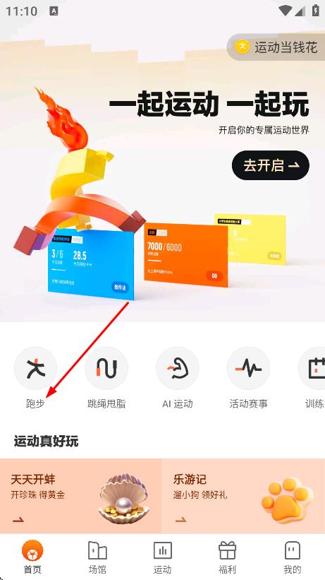 2、随后进入在首页,点击跑步,进入跑步相关页面。