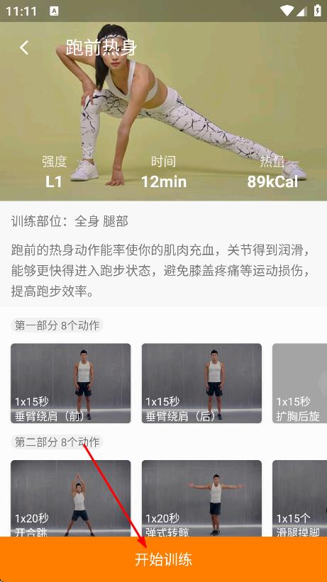 4、在跑前热身页面,点击开始训练,即可开始跑前热身训练。