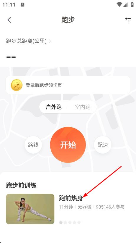 3、在跑步页面,点击跑前热身,进入跑前热身内容页面。