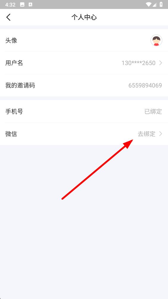 4、在个人中心页面里,找到微信选项,点击其右侧的去绑定,按照后续提示完成微信绑定操作。