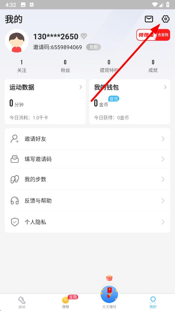 3、个人界面,信息明了,个人步数转化金币数