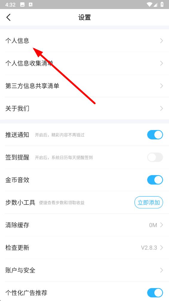 3、在设置界面中,点击个人信息选项,进入个人中心页面。