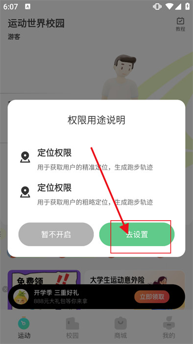 运动世界校园怎么开启权限?