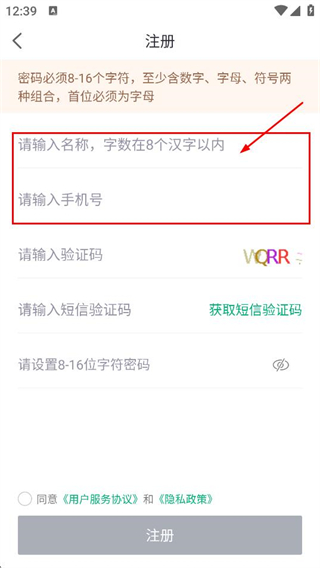 2、在注册页面,输入8个汉字以内的名称,再输入手机号。
