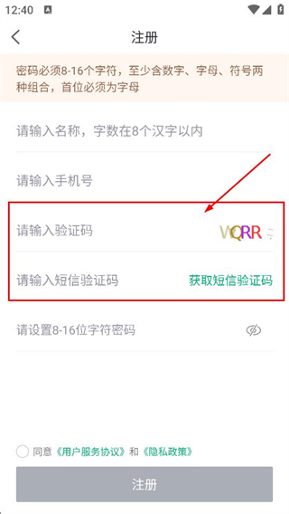 3、在注册页面,输入图形验证码,接着输入收到的验证码。