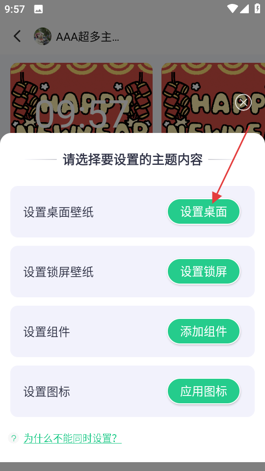 4、在弹出的设置选项中,点击设置桌面,将主题应用到桌面。