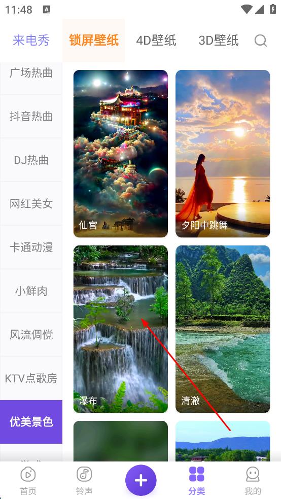 2、在分类里找到“优美景色”类别,点击进入后浏览锁屏壁纸,选中喜欢的“瀑布”壁纸,进入详情界面。