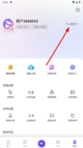 1、在视频铃声来电秀首页,点击右下角我的按钮,进入个人中心界面。