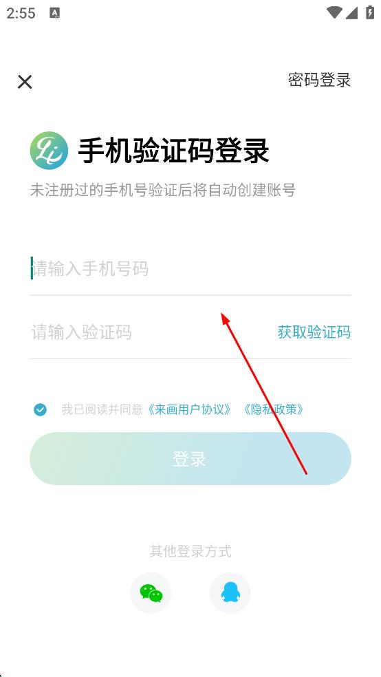 1、打开来画APP,输入手机号或其他平台信息,登录账号进入后进行下一步。