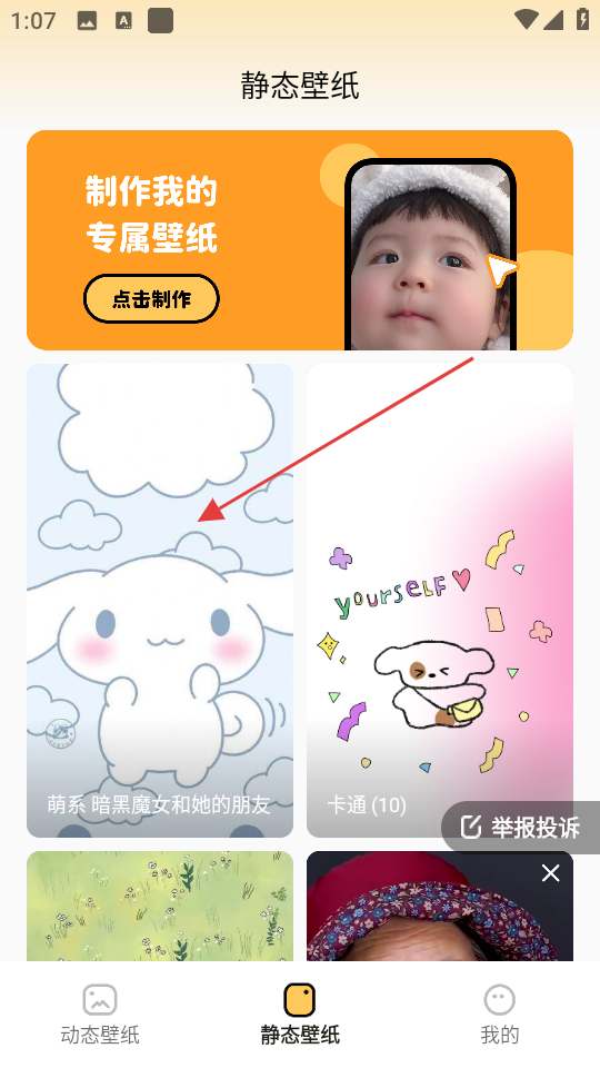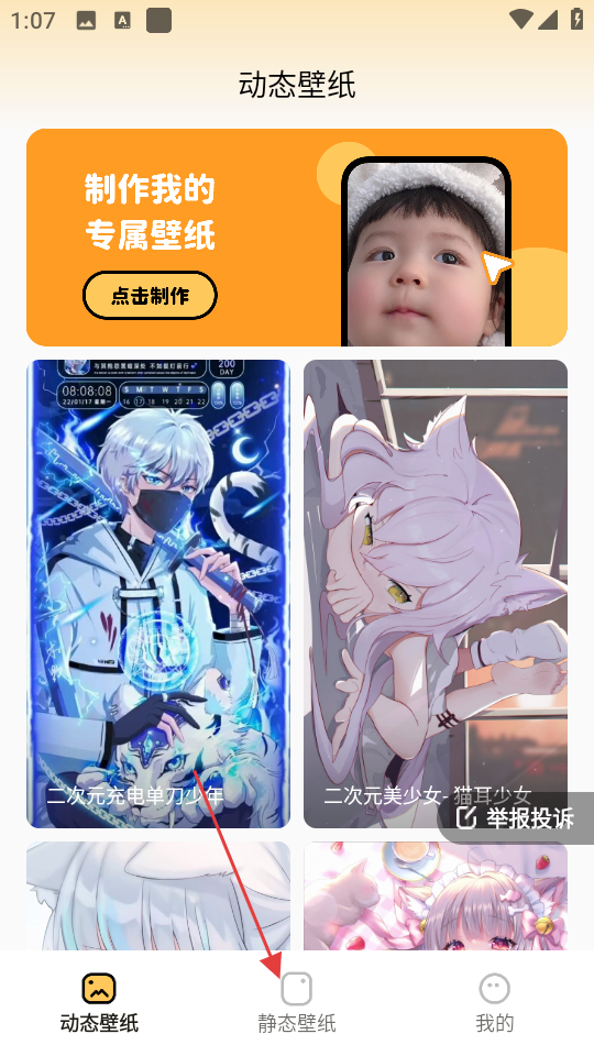 1、在壁纸应用动态壁纸页面,点击底部静态壁纸,进入静态壁纸页面。