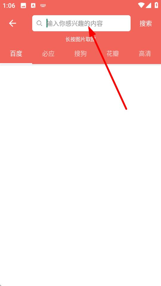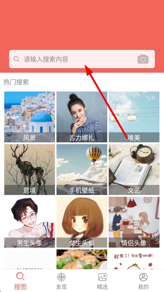 1、打开图片大全搜图神器APP,在搜图界面上方的搜索栏,点击请输入搜索内容区域。