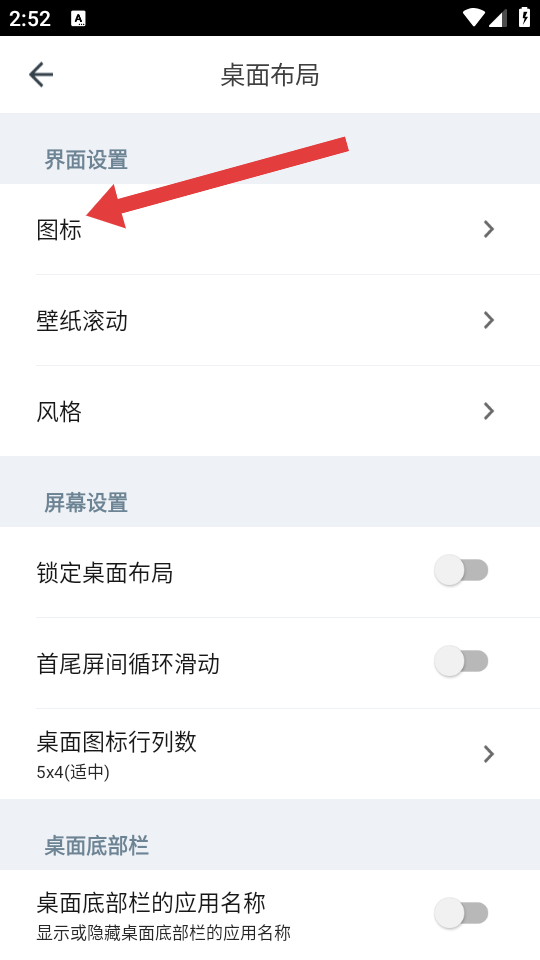 3、在桌面布局的页面,需要点击图标的选项,进入图标设置的页面。