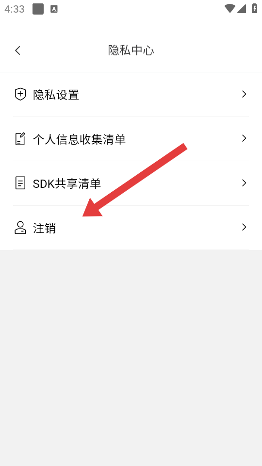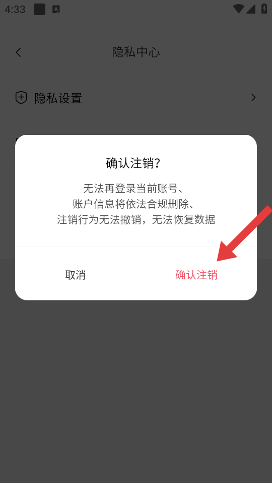 3、在隐私中心的页面,点击注销的选项,触发确认注销弹窗。