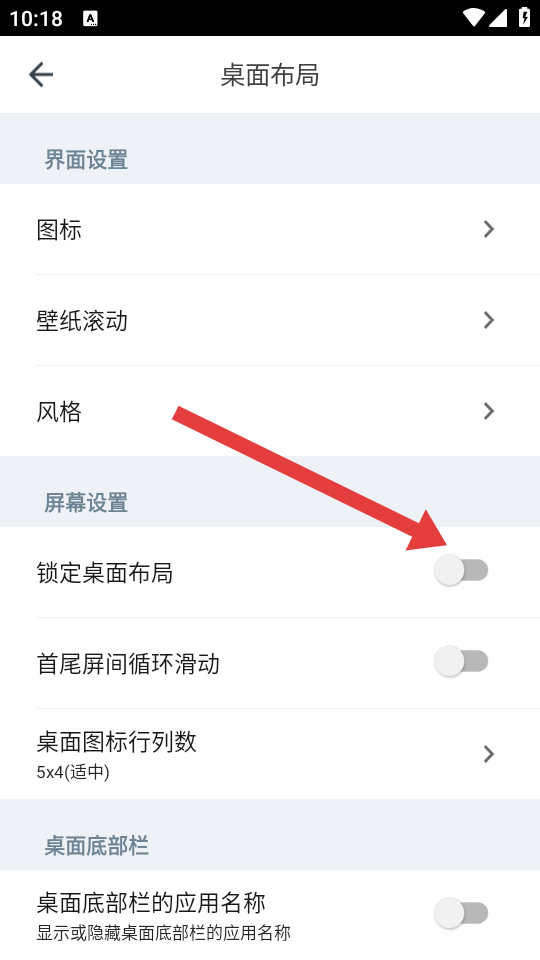 4、找到锁定桌面布局选项,将其右侧的开关滑动至开启状态,即可锁定桌面布局界面。