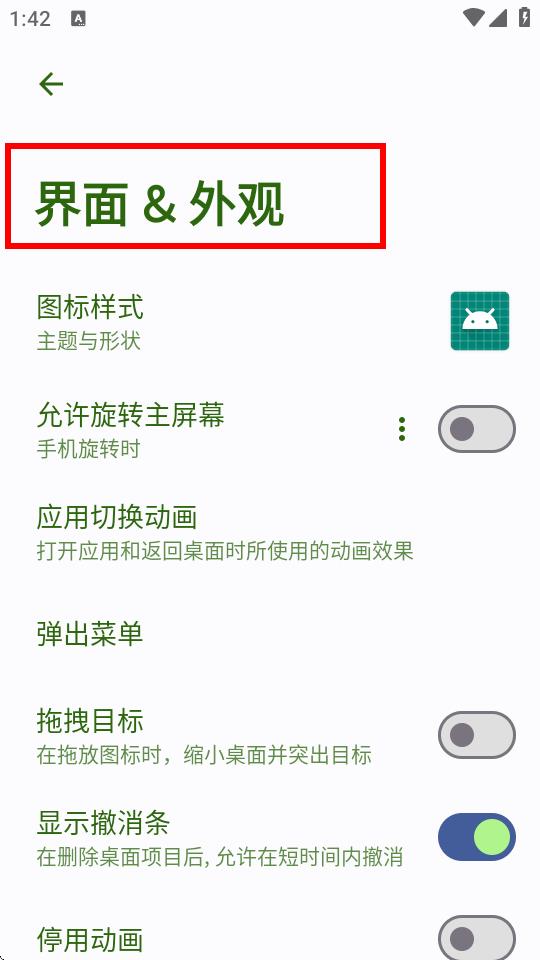 3、在界面外观设置页面,可对图标样式、应用切换动画等进行设置,打造个性化界面。