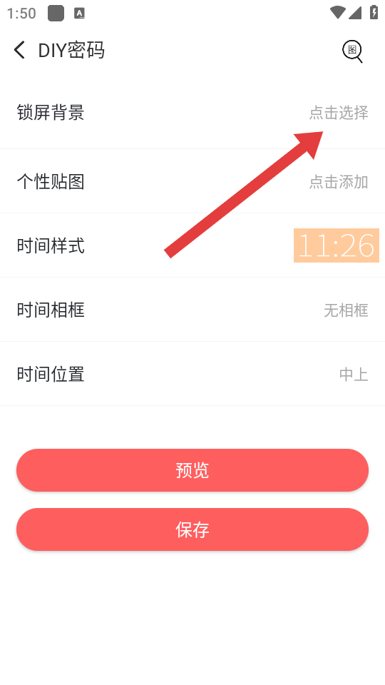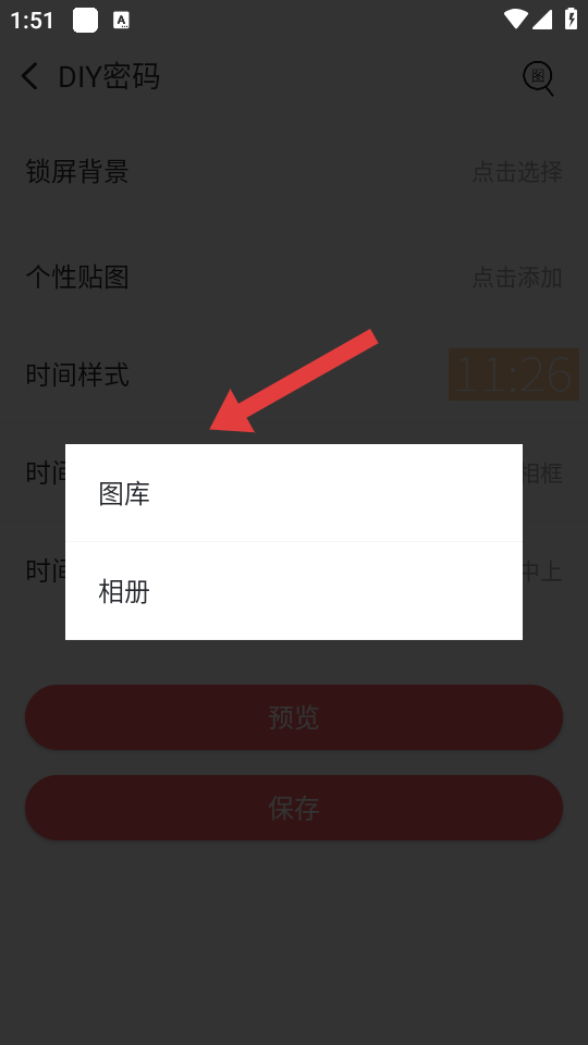 3、在DIY密码设置界面,点击锁屏背景点击选择按钮,触发图片来源选择弹窗。