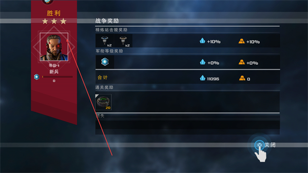 4、击败敌方后显示胜利,获取战争奖励,点击关闭界面完成关卡。