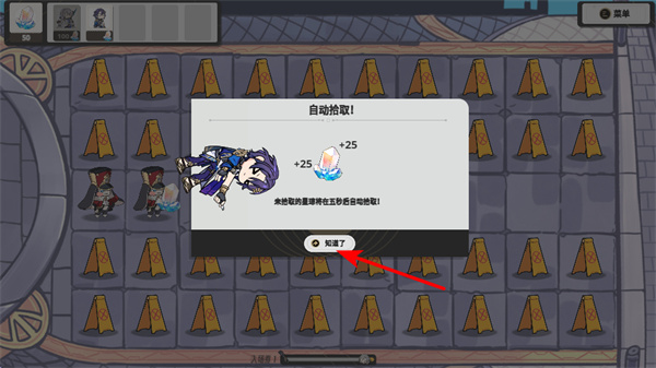 3、领取战斗资源,在自动拾取提示界面,领取战斗中获得的资源,积累资源用于角色升级、技能解锁等,提升战力。