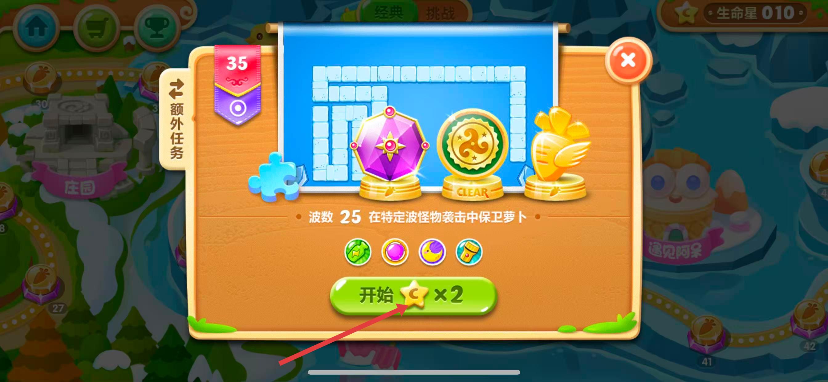 3、在第35关详情页,查看通关条件,,消耗2颗星星点击开始按钮,进入战斗界面。