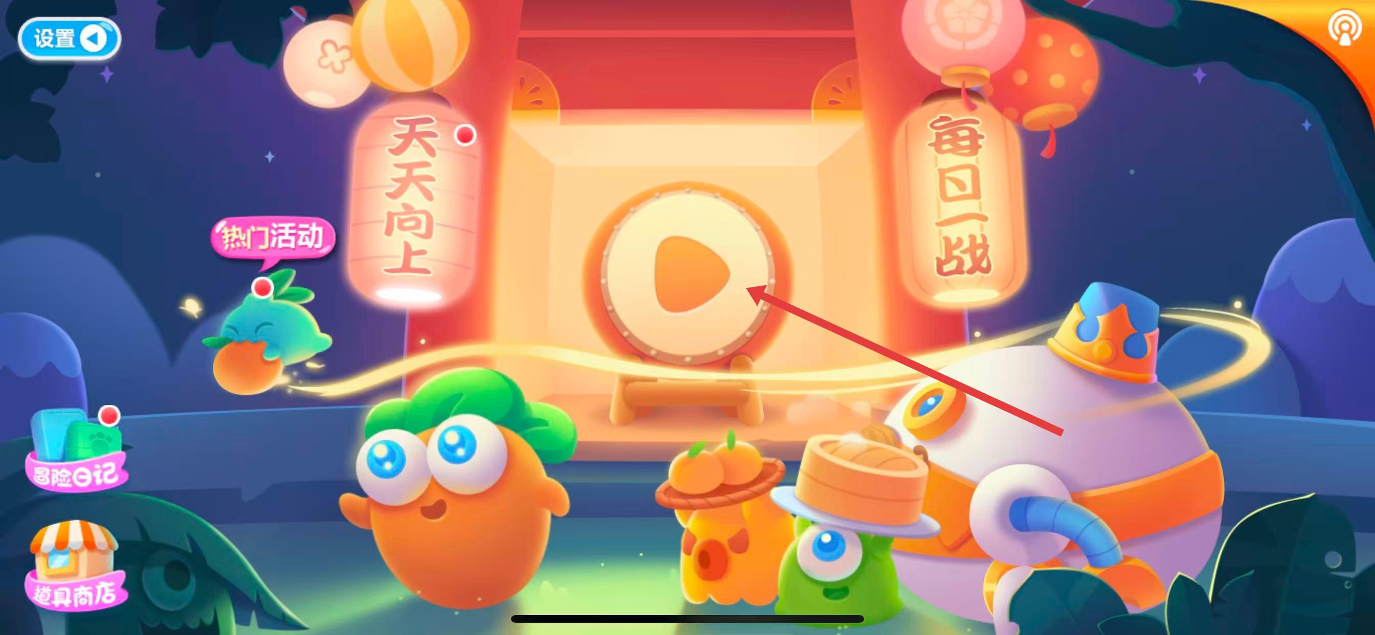 1、在游戏主界面,按红箭头指向,点击中间大鼓样式的播放按钮,进入关卡地图选择页。