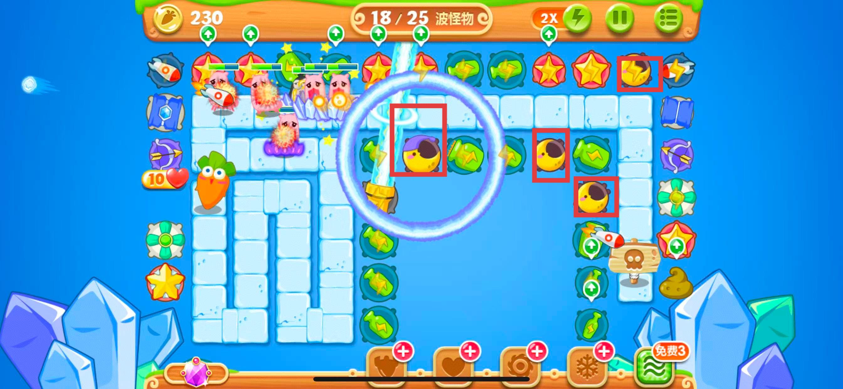 4、战斗中,本关的重点在于空位上建造减速的月亮塔。