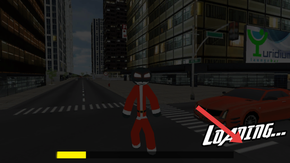 1、在游戏加载界面,可看到穿着红色服装的火柴人角色和城市街道场景,加载完成后将进入游戏,开启城市冒险之旅。