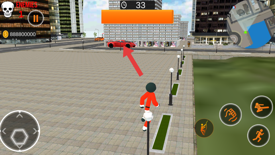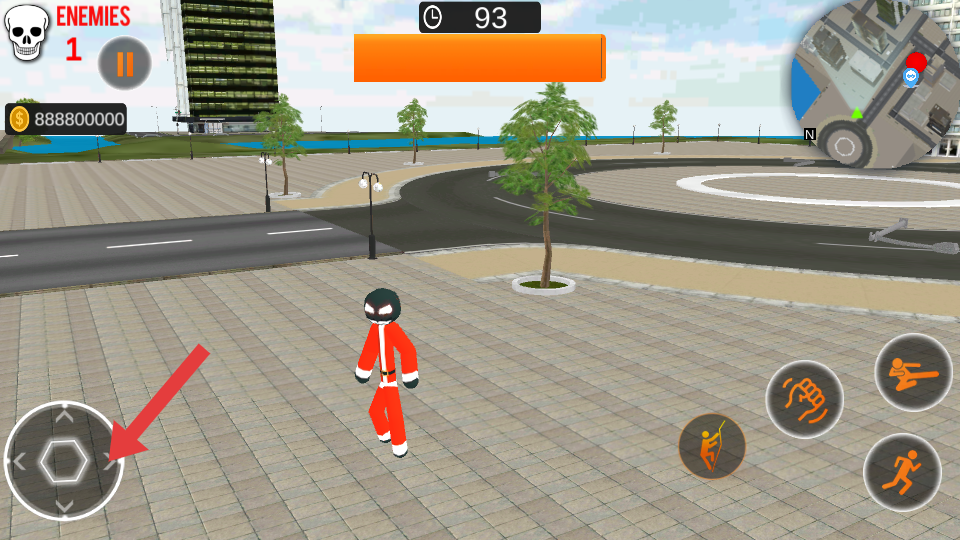 2、通过虚拟摇杆控制火柴人角色在城市广场移动,这是探索场景、完成任务的基础操作,界面显示了敌人数量金币数。