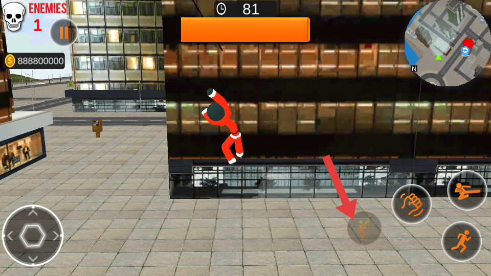 3、点击技能按钮,使火柴人角色执行特殊动作,如攀爬建筑,通过特殊动作可到达不同区域,发现新的游戏内容。