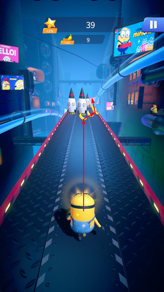 2、游戏中途,在奔跑过程中灵活运用格鲁的火箭、护盾等道具,收集沿路香蕉与服装卡牌,同时躲避障碍、击败坏人,解锁卡尔、杰里等更多小黄人。