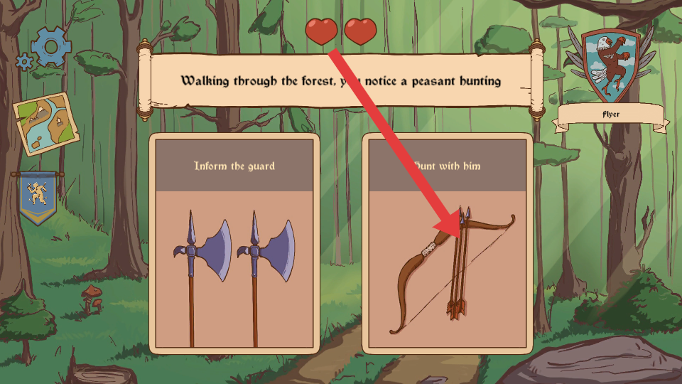 1、在冒险决策游戏中,遇到林中农民狩猎的场景,选择和他一起狩猎可获得弓箭道具,道具在后续冒险用于远程攻击。