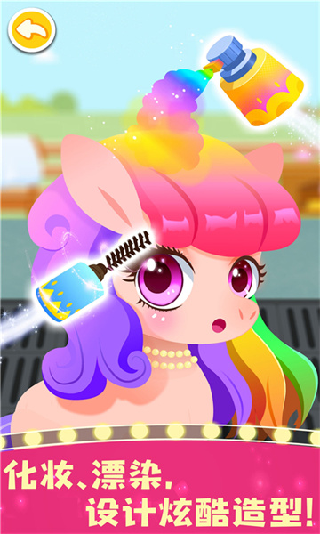 快来装扮小马:画个橘粉色腮红、涂个长睫毛、喷上blingbling的闪粉,精致的妆容完成啦。刘海挡住眼睛,快用剪刀修理一下。最后,喷上染发喷雾,橙黄、浅紫……变身彩虹小马!