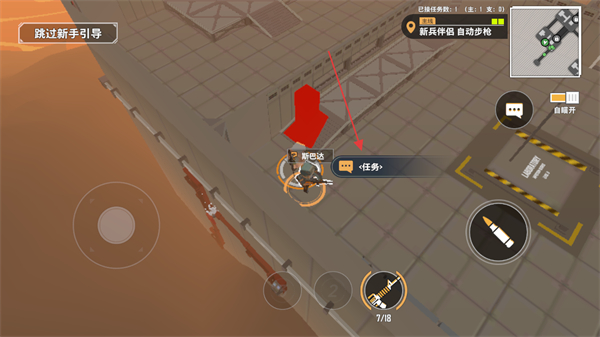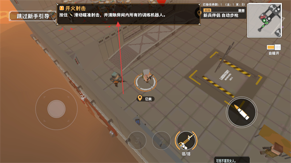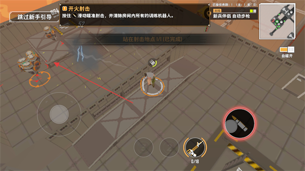 1、根据新手引导,按住并滑动瞄准射击,消灭房间内所有训练机器人。