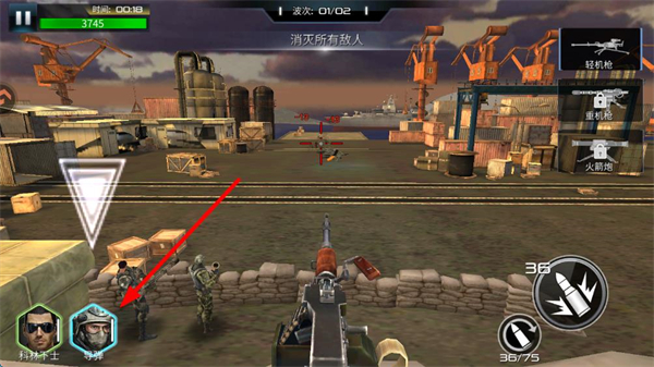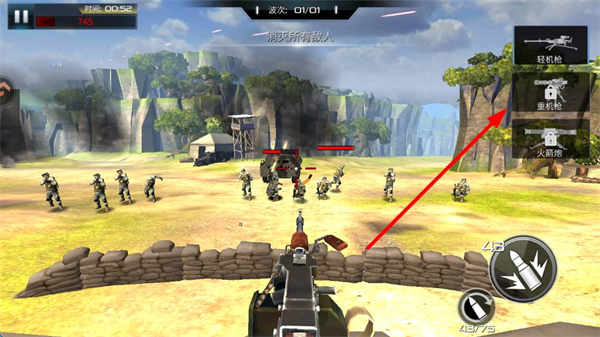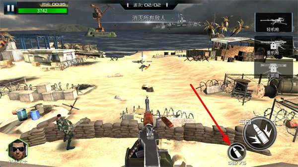 2、右侧可切换轻机枪、重机枪、火箭炮等武器,轻机枪适合应对步兵,需根据敌人类型灵活切换。