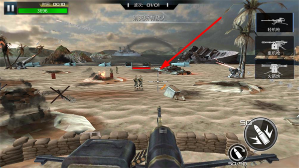 1、游戏战斗中通过滑动屏幕瞄准敌人,点击右下角射击按钮进行攻击,面对不同敌人需及时调整瞄准方向。
