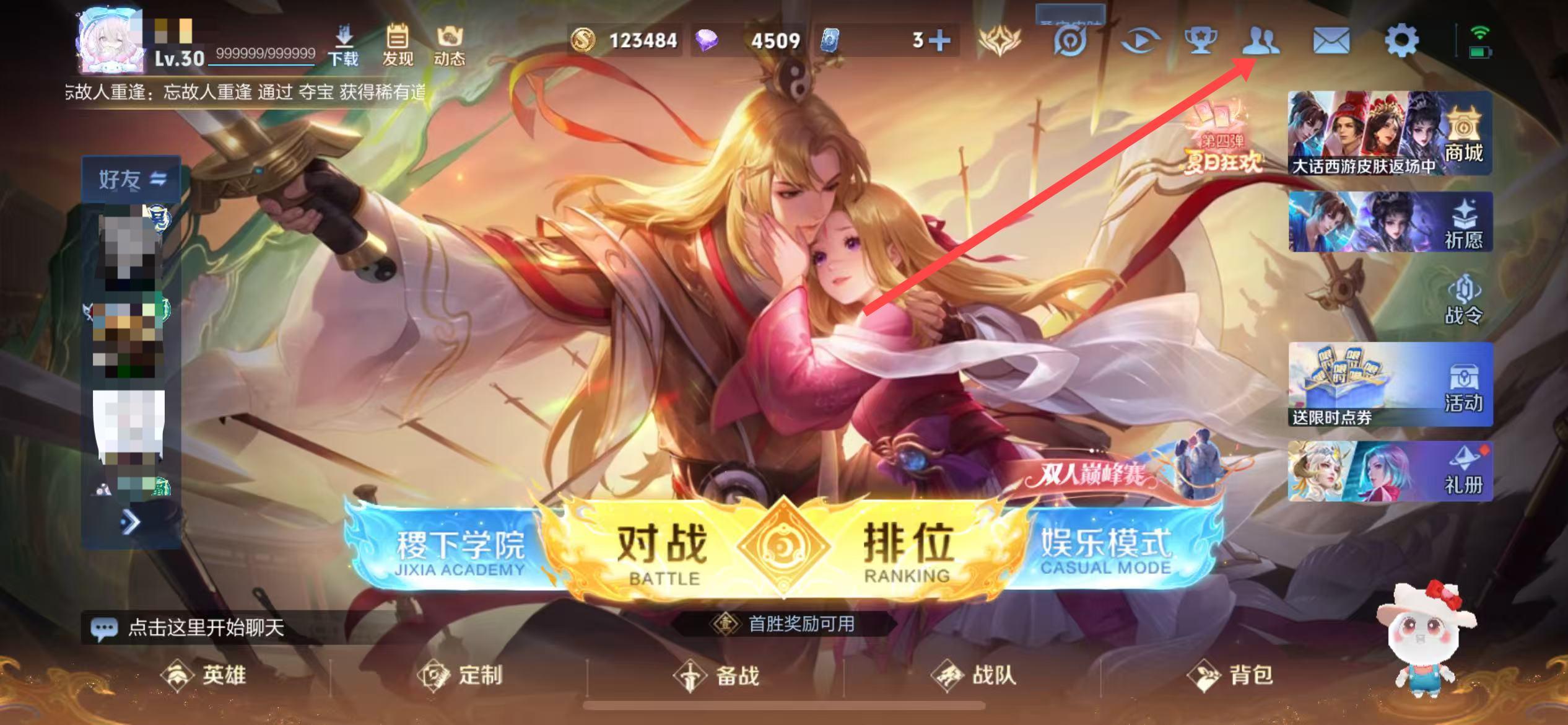 1、打开王者荣耀云游戏,进入游戏主界面,点击界面上方的好友图标,进入游戏关系界面。
