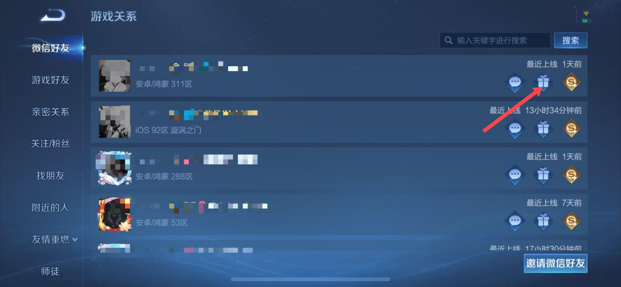 2、在游戏关系界面,选择想要赠送皮肤的好友,点击其信息栏右侧的礼物图标。