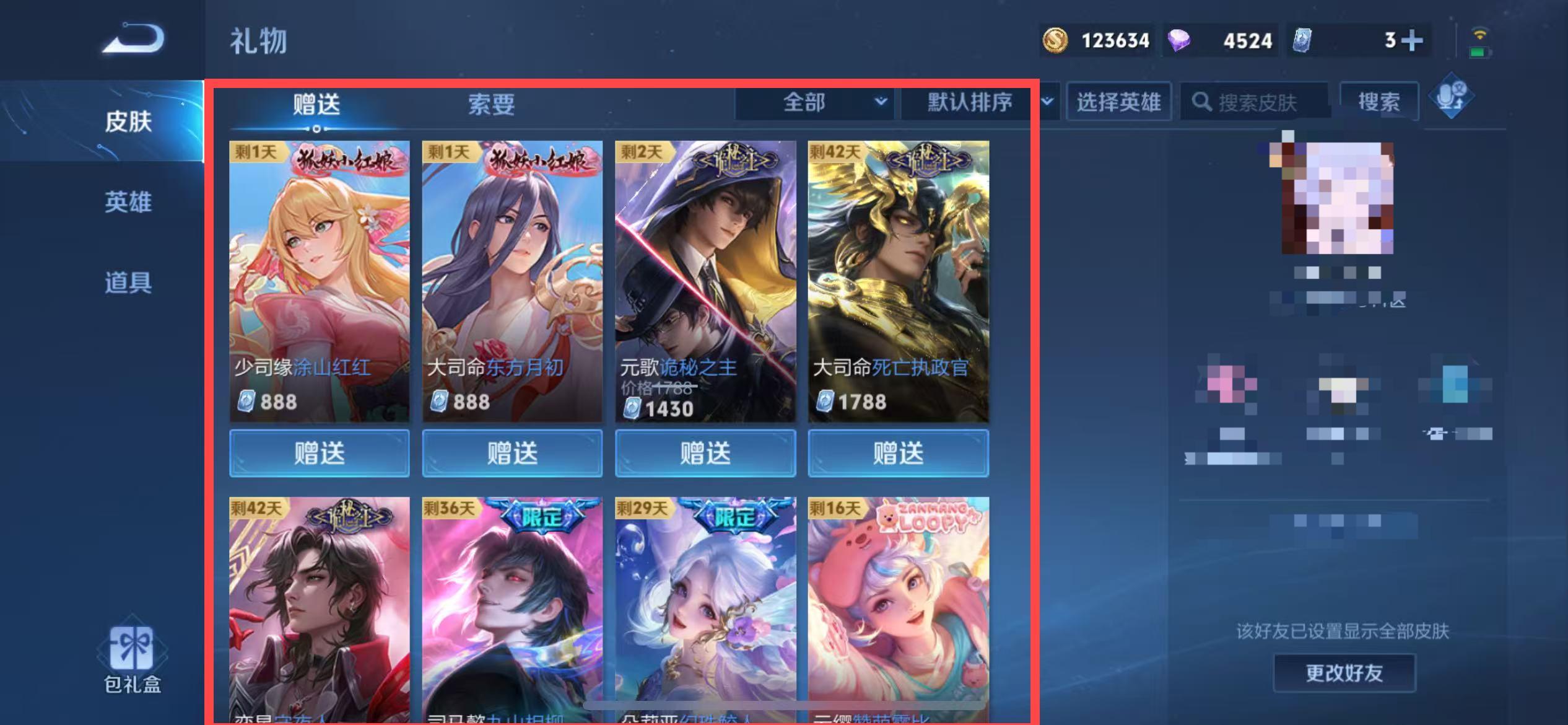 3、点击左侧的皮肤选项,选择想要赠送的皮肤,点击皮肤下方的赠送按钮,按照提示完成支付等操作。