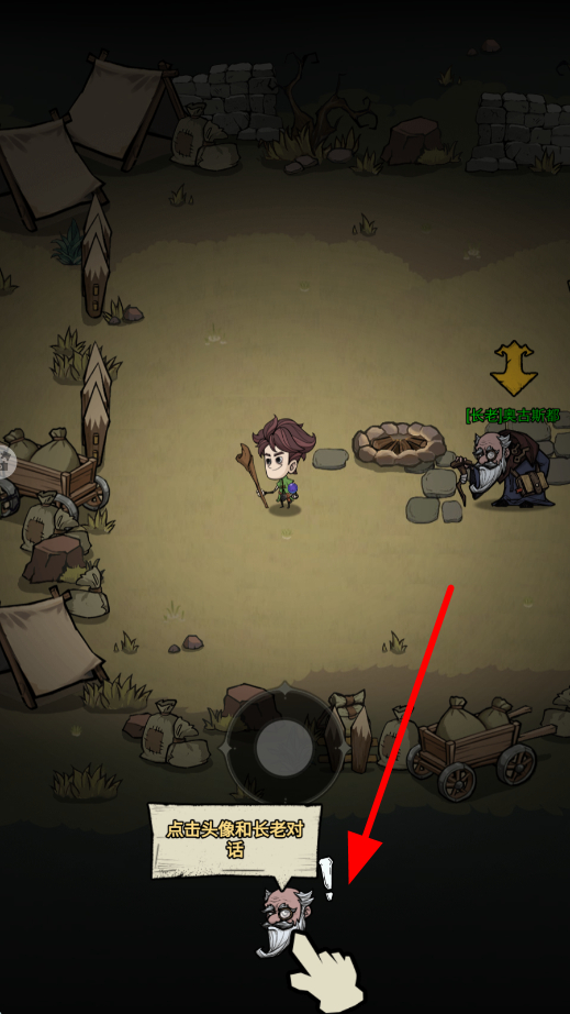 2、进入场景后,遇到像长老这样的角色,点击其头像,与长老对话,从对话中获取探险相关的信息与任务,为后续探险指引方向。