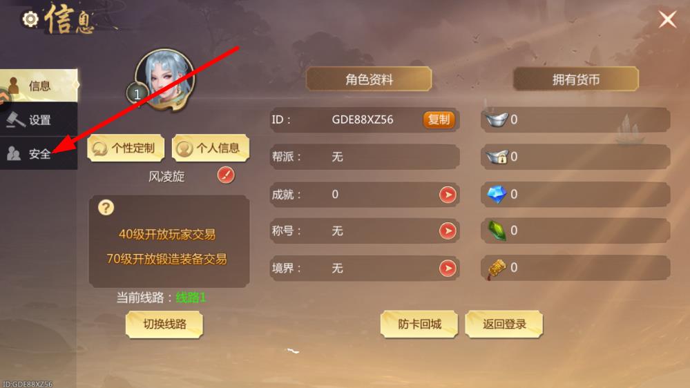 3、在角色信息界面,点击左侧安全选项,进入安全设置页面。