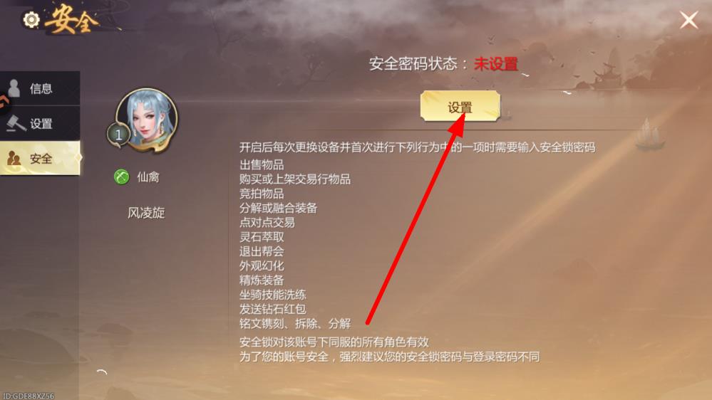 4、在安全设置页面,看到安全密码状态为未设置时,点击设置按钮, 即可进行安全密码设置。