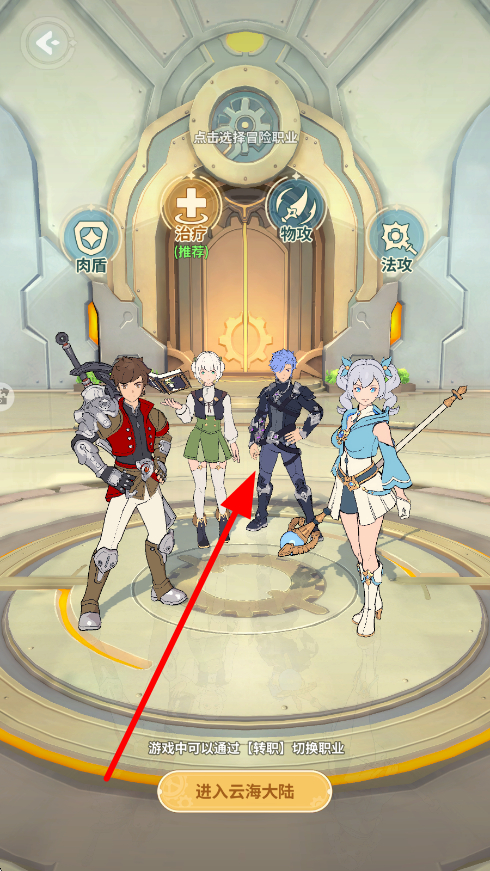 1、进入游戏后,在职业选择界面,有肉盾、治疗、物攻、法攻等多种职业可供挑选,选好心仪职业后,点击进入云海大陆,开启冒险之旅。