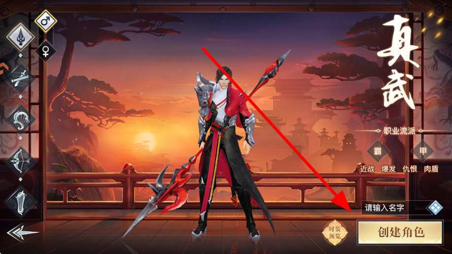 1、玩家在角色创建界面,选择真武等职业,输入名字后点击创建角色,开启在龙武的仙侠冒险之旅,开启后续的探索进程。