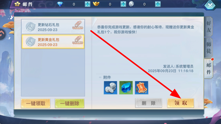 3、然后查看邮件,若有更新黄金礼包等奖励,点击领取,获取礼包内的钻石、道具等,用于提升角色能力或助力任务完成。