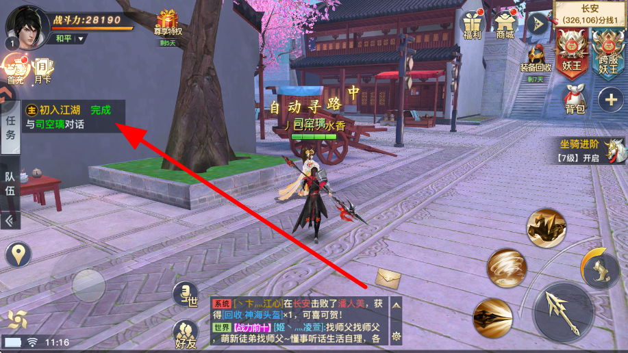 2、接着在长安等场景,接取初入江湖等任务,按照任务要求,与司空瑶等NPC交互,推进任务的进行,了解游戏的剧情与玩法。