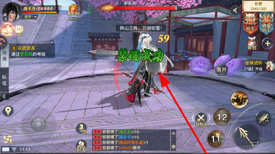 4、以武会友任务中,与李长风等对手交战,运用技能通过考验,完成任务获取强化石、银币等奖励,继续体验仙侠世界的内容。