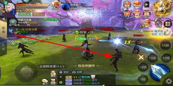 2、玩家在主界面开启自动寻路功能,跟随剧情任务指引移动到目标NPC处,推进主线剧情的流程。