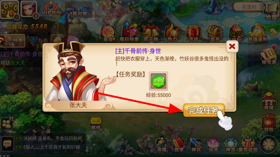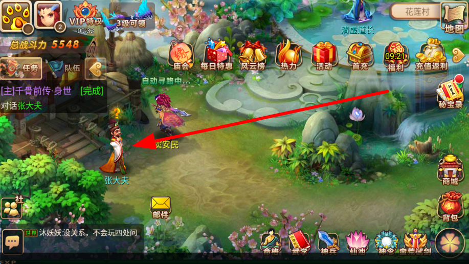 2、接着进入花莲村等场景,与张大夫等NPC交互,接取任务,按照任务要求去完成,完成后可获取奖励,提升角色等级。