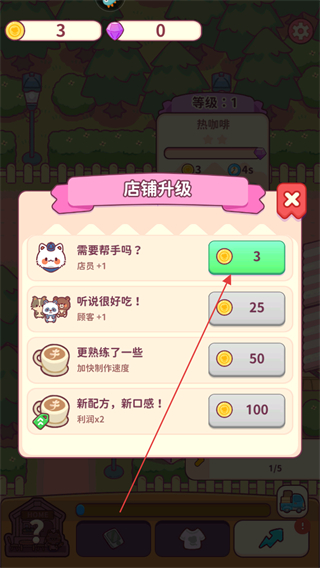 4、积累金币后,进行店铺升级如消耗3个金币增加店员,提升店铺运营效率,吸引更多顾客。